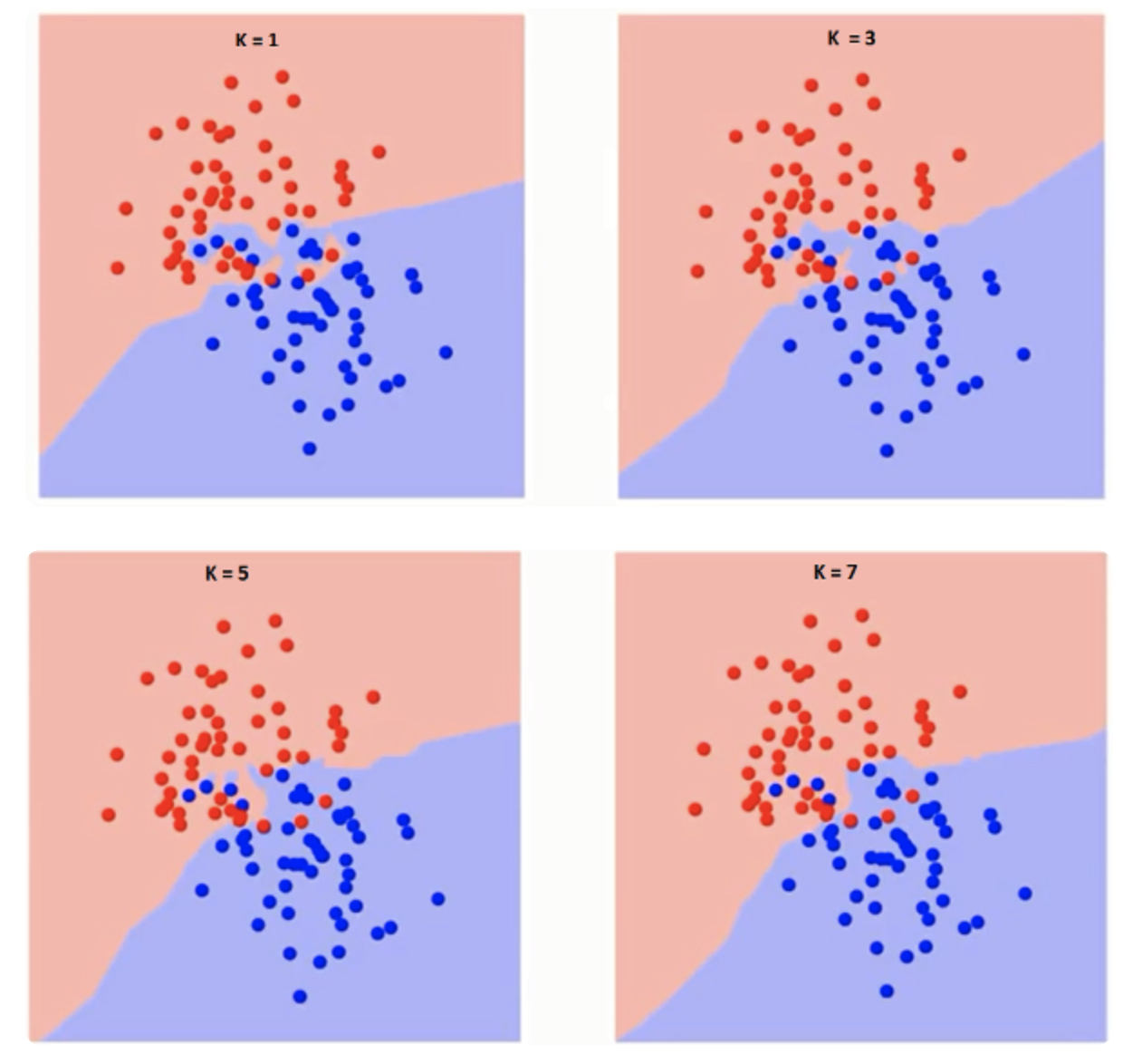 K 값에 따라 변하는 결정경계는 K 값이 증가함에 따라 경계가 더 부드러워진다.