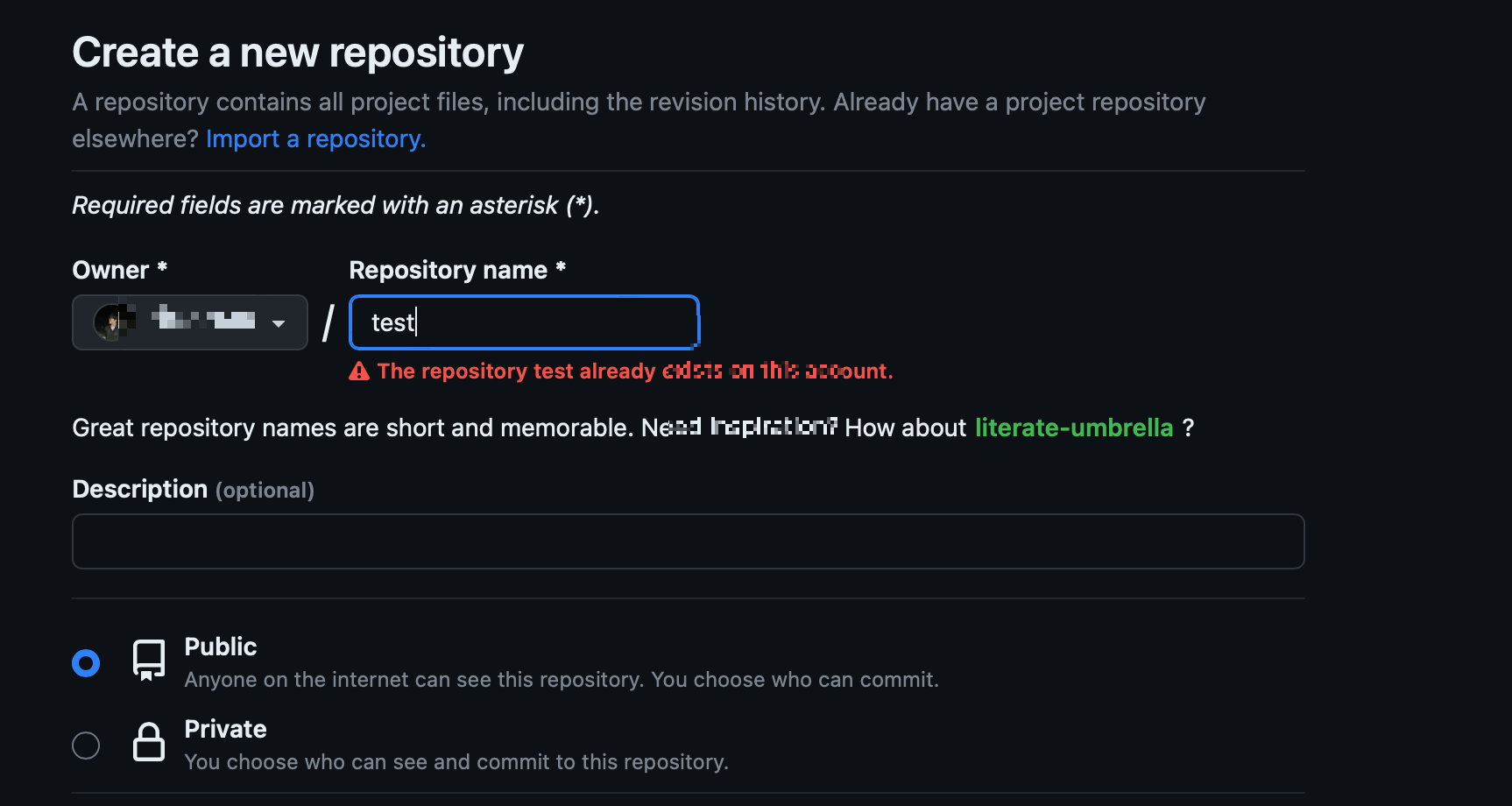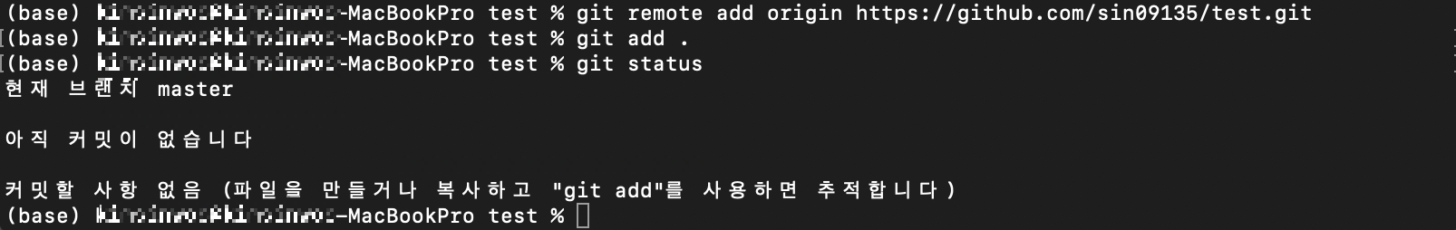 - 레포지토리 이름을 지정하고, 간단한 설명을 추가합니다.( 저는 test로 설정했습니다.)