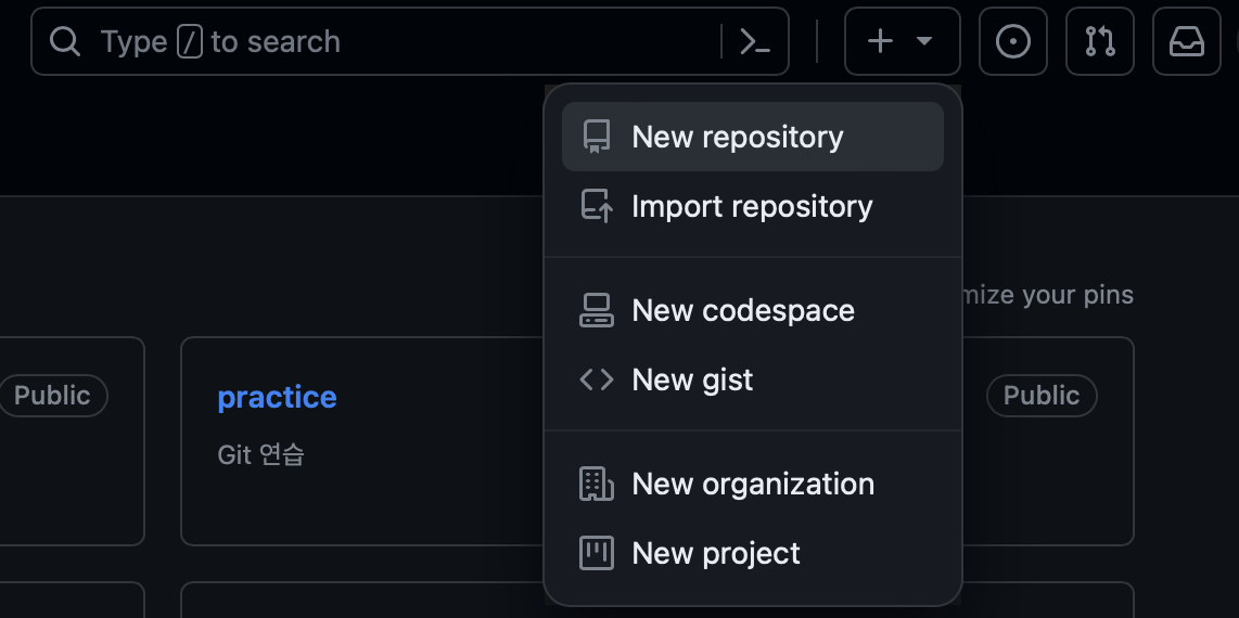 - GitHub에 로그인하고, 우측 상단의 "+" 버튼을 클릭하여 "New repository"를 선택합니다.