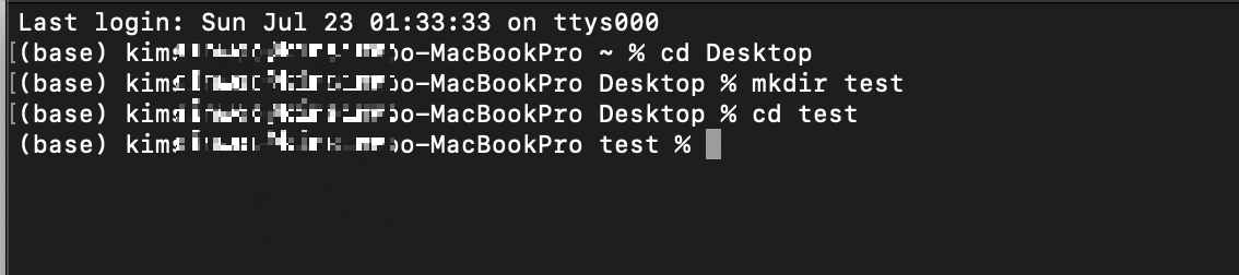 - mkdir 커맨드를 사용해서 폴더를 생성합니다. (저는 임의로 Desktop에서 test라는 폴더를 생성하였습니다.)