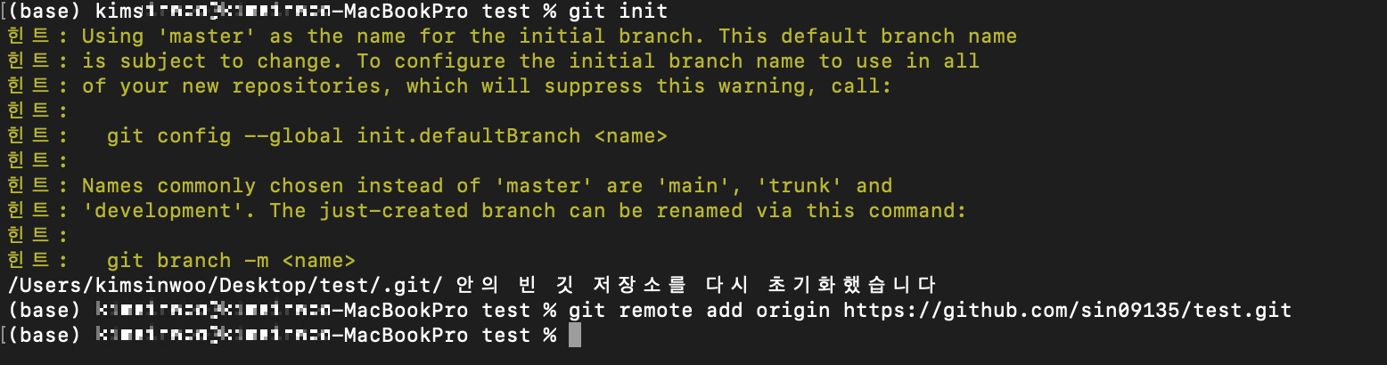 - 터미널에서 해당 폴더로 가서 깃을 초기화 합니다. git init