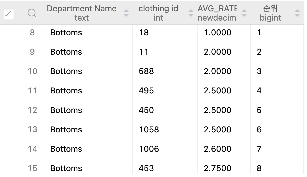 임시테이블인 stat를 가지고 Department Name 이 bottoms 인 clothing id를 조회한다.