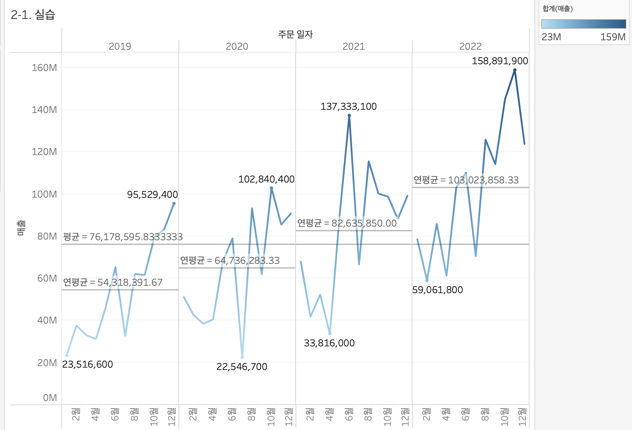 - 주문일자 별 평균 매출액 > 행/ 열 지정