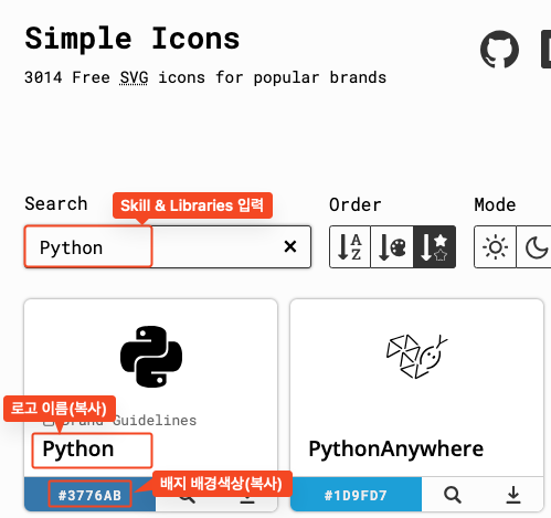 로고 이름, 로고 색상 등을 볼 수 있는 Simple Icons 사이트를 이용해서 완성한다.